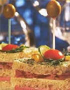 8 ломтиков белого хлеба, 4 ч. ложки слив. масла, 1 небольшая луковица, 4 ломтика филе копченой рыбы, 1 ч. ложка лимонного сока, веточки петрушки и укропа.