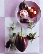 Очищенные баклажаны разрезать вдоль на дольки и положить на 3 часа в соленую воду. Затем дать воде стечь, баклажаны слегка отжать и уложить (вдоль) в литровые банки. В середину банки положить разрезанный на 4 части помидор, лук, чеснок и перец, 1-2 ст. ложки сахара, ½ ст. ложки соли и 1 ч. ложку уксуса. Содержимое банки залить холодной водой, прикрыть крышкой и стерилизовать 40 минут. После стерилизации немедленно закатать.