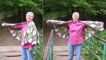 Идея использования разноцветных ромбов в круглом полотне продолжена в шали. Из четырех ромбов связанных узором «простая плетенка» сделана серединка, далее полотно расширяется цветными ярусами из ромбов простой плетенкой и рядов столбиков без накида до необходимого размера. При вязании небольших элементов вместо длинного крючка использован обычный короткий.