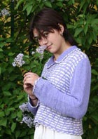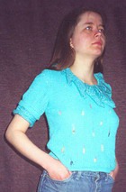 Блузон связан длинным крючком 4,0 из пряжи московской фабрики "Камтекс" (хлопок 100%, 280 м / 100 г). Расход пряжи основного цвета - 300 г, отделочного - 100 г. Спинка, перед и рукава блузона связаны в поперечном направлении (от линии бока и от нижнего шва рукава) узором "плетенка" с вертикальными отверстиями по выкройке с втачным рукавом.