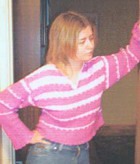 Интересно смотрятся двухцветные изделия, в которых использованы полоски разной ширины. В этом блузоне полосы одного цвета расширяются, другого – уменьшаются.
