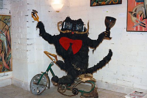 Украшение музея - жутковато-комичная скульптура булгаковского Кота Бегемота, созданная Виктором Корженевским из различных подручных материалов - от дерева до бинтов. Черный монстр в очках восседает на старом двухколесном велосипеде. Руки-коряги растопырены, в одной он держит рюмку, в другой - маринованный грибок… Под хвостом - «рукопись, которая не горит».