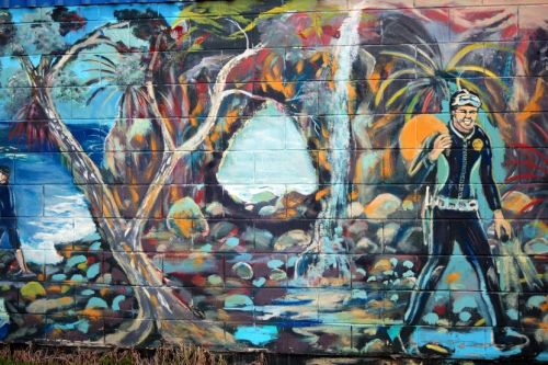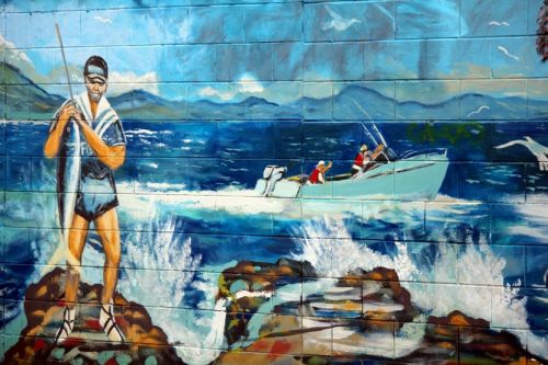 На этот раз на стене метров десяти в длину (я так и не смогла захватить полностью картинку) был изображен каменистый берег с отдыхающими, серфингистами, рыбаками и купающимися. К слову, в Онехунге как раз тоже есть отличный пляж.