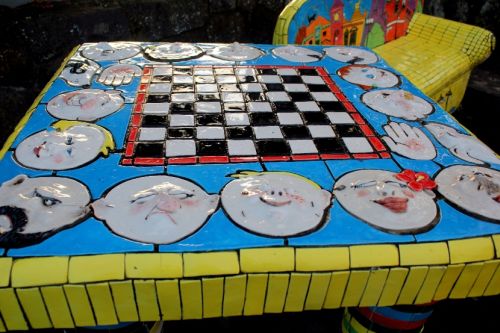 Находится она перед церковью Святого Петра и представляет собой ярко-желтую лавку из керамической плитки. На спинке лавочки выложены небольшие разноцветные домики. А рядом стоит небольшой стол. Ножки стульев сделаны, как руки и ноги человека. На столе окантовкой расположены человеческие лица с разными эмоциями, а посередине стола – шахматная доска.