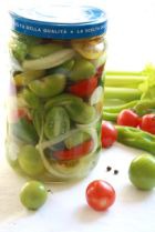 Потребуется: 3,5 кг зеленых помидоров, 1,5 кг болгарского перца, 1,0 кг репчатого лука, 2/3 стакана сахара, 1 стакан растительного масла, 3 ст. ложки соли, 8-10 горошин душистого перца, 5-6 лавровых листиков, ½ стакана уксуса.