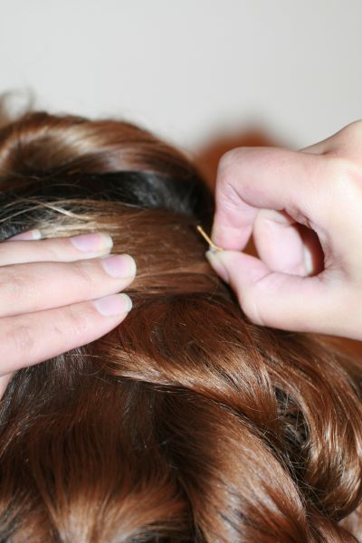 4. Возьмем пряди по обе стороны от висков и закрепим их невидимками крест на крест.