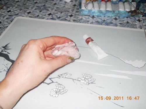 Нужно учитывать, что окончательный цвет будет гораздо темнее, поэтому пусть вас не смущает бледный вид цветов и зелени. Можно предварительно попробовать на небольшом кусочке, чтобы впоследствии ориентироваться в цвете и яркости.