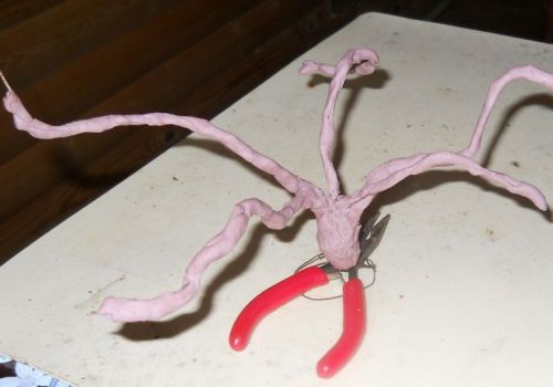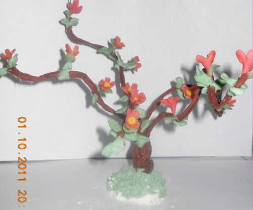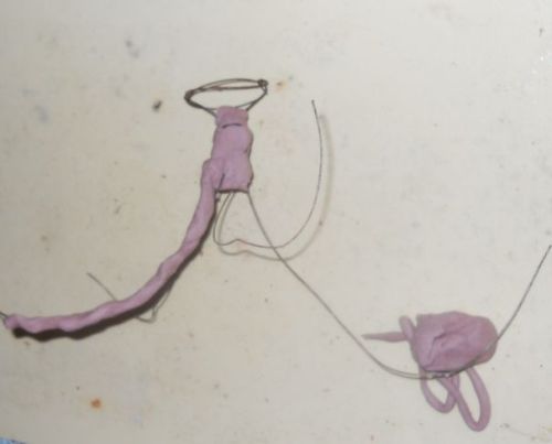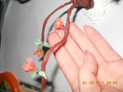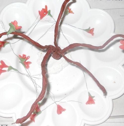 Небольшой кусочек массы окрашиваем в коричневый цвет и равномерно опутываем проволоку массой, имитируя кору. Оставляем просыхать на сутки.