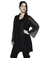 Укороченный жилет на пуговицах с глубоким декольтированным вырезом поверх пестрой туники. Благодаря умелому сочетанию цветов наряд не будет вас полнить, совсем наоборот, такой образ выгодно подчеркнет ваши достоинства.