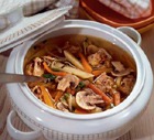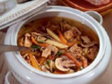 Сварить бульон с 2 луковицами, 1 морковью, 5-10 зернами перца, 2-3 штуками лаврового листа и 1/3 фунта грибов, процедить.