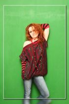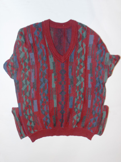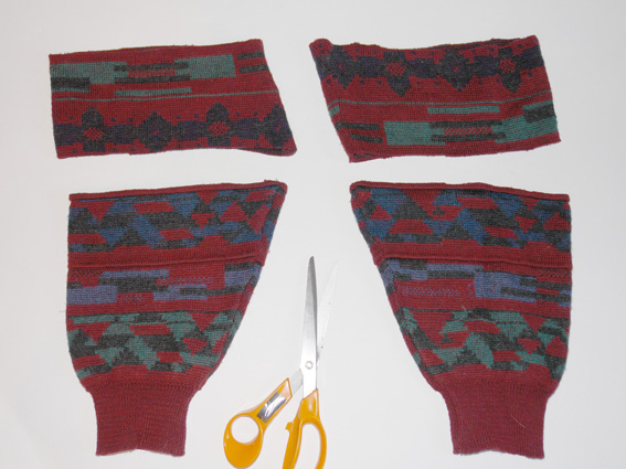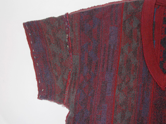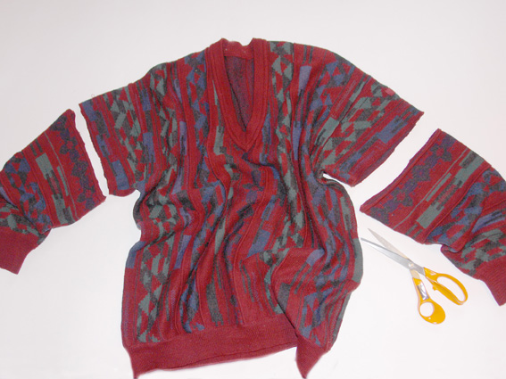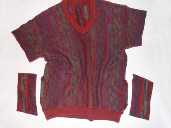 Переверните джемпер, бывшие рукава заправьте внутрь, это будут карманы, а нижняя резинка - вырезом лодочкой. Поскольку горловина этого джемпера была V-образной, его можно носить еще и задом наперед. Но это вы решите сами при примерке.