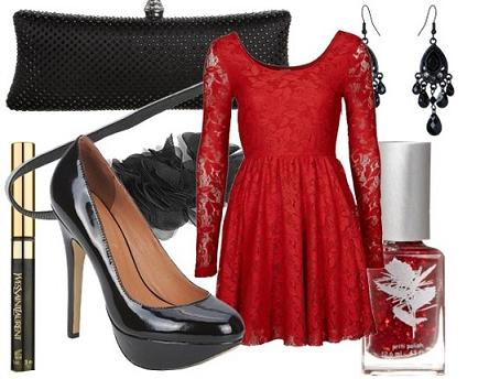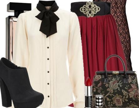 Черный, белый и глубокий красный – вот основа, а винтажная сумка с гобеленовым рисунком – завершающий аккорд этого необычайно женственного образа.