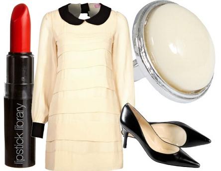 Контрастный воротник в стиле Peter Pan и такие же манжеты прекрасно будут смотреться с черными лодочками. Завершит образ старинного вида кольцо.