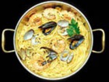 На оливковом масле обжарить 3-4 зубчика чеснока и немного лука порея (мелко порезать), туда добавить любые морепродукты (крупные креветки, морской гребешок, кальмары и очищенные мидии), соль, перец, обязательно травы итальянской кухни. Жарить 3-4 минуты, затем добавить 20%-е сливки и тушить еще минуты 3-4. Этим соусом залить любые макаронные изделия.