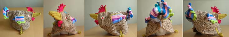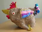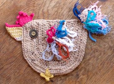 Из 200 г толстых коричневых ниток и разных остатков разноцветных ниток крючком 4.0 связан петушок (грелка на чайник) и два цыплёнка(подставочки).