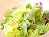 Сухари смешать с растительным маслом и вылить на листья салата.