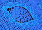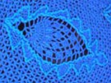 Шаль «Розовые шишки» оказалась настолько удачной, что по ее мотивам была сделана еще одна шаль из более тонких синих ниток с более нежным оформлением листочков/шишек, нижний край новой шали оформлен кистями. Используя простые приемы, легко изменить схему вязания для увеличения размера «шишки», а меняя форму листьев и количество галочек между «шишками», удобно обеспечивать форму плоского полукруга шали. В изделии использованы расположенные на трех уровнях «шишки» 3-х размеров.