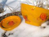 Первым моим опытом были кухонные деревянные дощечки, потом я в таком же стиле разукрасила глиняный кувшин из-под грузинского вина. Но подаренный мною комплект пока только украшает мамину кухню, она никак не решается использовать "такую красоту" по назначению.
