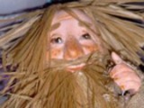 Из лыка сооружена лохматая шевелюра и борода, поясок сплетен "на пальцах" - старинный метод плетения обереговых поясов, добавлены атрибуты из пластика - ключ от дома, ложка, оберег утка-конь, и мешочек с гречкой. Ну и, конечно же, монетка - для того, чтоб в дому прирост богатства наблюдался ;)