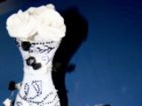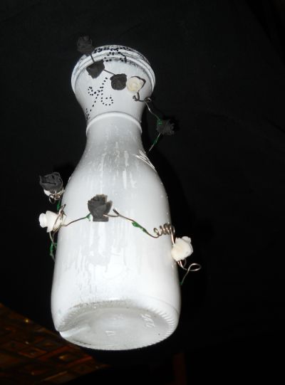 Тщательно обезжириваем бутылку. На улице красим её краской из баллончика, в нашем случае белого цвета, и оставляем сохнуть. Наносим понравившийся орнамент маркером и намечаем места, где будут прикреплены цветы.