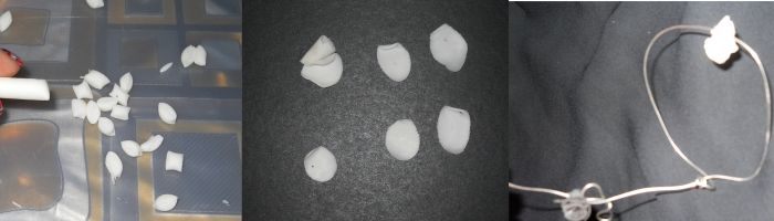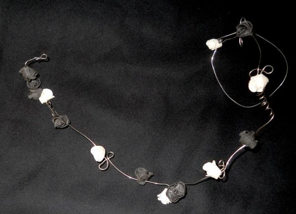 Раскатываем лепестки и соединяем их в бутон. На бутон накручиваем лепесток, и так по мере необходимой пышности цветка. Размер розочки - 0,5 или 1 сантиметр. Получатся розочки двух цветов. Насаживаем на проволоку получившиеся бутоны, чередуя белые и чёрные цветы. Затем загнём незатейливые лепестки, которые располагаем около розочек.