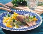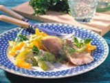 Из расчета на 1-2 порции потребуется: 200 г апельсинов, 180 г яблок, 80 г сахара, 50 г сухого белого вина, 30 г грецких орехов.