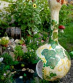 1. Прежде всего, надо обезжирить тарелку и удалить с неё пыль, протерев её поверхность тампоном, смоченным в ацетоне или спирте. Далее необходимо загрунтовать поверхность тарелки белой акриловой краской. Для этого вначале мягкой кистью надо закрасить всю внутреннюю сторону тарелки, а затем с помощью кусочка поролона тампонирующими движениями еще раз покрыть всю поверхность краской. Это выровняет краску. В центре высверливаем дырку диаметром 8 мм. Также это можно сделать нагретым гвоздем.
