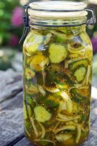 Кабачки вымыть, срезать оба конца и нарезать крупными кусками, уложить в банки рядами, между кабачками листья вишни, смородины, хрена, сельдерея.