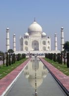 ...На третий день мы отправились на юг, в Агру, смотреть Тадж-Махал – мавзолей, построенный царем Шах Джаханом в честь любимой жены Аз-Мумтаз. Сложенный из полированных плит белого мрамора, усыпанный полудрагоценными камнями, изваянный гениальными зодчими, он... всё сказанное не передаст и сотой доли этого великолепия, гармонии и совершенства. Считается, что это образец симметрии. Если стать строго по центру длинного водоёма напротив храма, то весь он отразится в воде, как в зеркале...