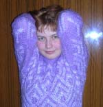 Для изготовления джемпера потребовалось 400 г мохеровой пряжи «Камея» 100 м/50 г (из них 300 г сиреневой и 100 г белой), спицы 3,5. Модель связана в лоскутной технике и составлена из ромбов, выполненных по схеме 1, половинок ромбов по низу рукавов и переда/спинки – схема 2, неполных ромбов – схема 3 – у горловины. Треугольники по линии скоса рукавов довязаны неполными рядами по выкройке. Направление вязания всех ромбов по стрелке – от линии плеча вниз.