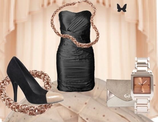 Начнем с черного платья, как-никак, на носу год черной водяной змеи. Выбирайте тот фасон, который подойдет именно Вам. На иллюстрации – драпированное платье, которое подчеркивает все прелести и изгибы, отличный выбор для обладательницы стройной фигуры. Обратите внимание на аксессуары карамельных и медно-красных оттенков – необычный стилистичесий ход, который принесет Вам победу!