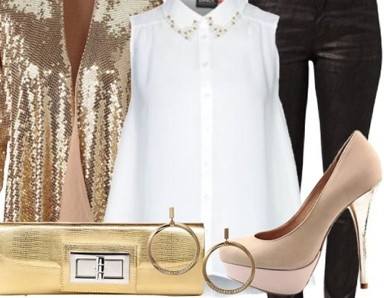 А почему бы вам не появиться на вечеринке в блестящем кардигане и в брюках skinny? Дополнив наряд белой блузкой и туфлями нежного оттенка пудры, Вы будете выглядеть великолепно.