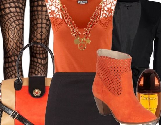 Наряд под цвет мандаринов будет нести радость и витаминный заряд не только Вам, но и окружающим! Яркий топ без рукавов, замшевые сапожки и сумка пусть будут оранжевыми. А сдержанности придадут черные юбка и пиджак. Ажурные колготки сейчас в моде, возьмите на вооружение!