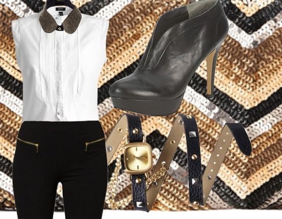 Воротники – тренд этого сезона, они могут быть блестящими, украшенными бусинами или камнями. Сам по себе такой воротник – уже яркий акцент, поэтому дополнят его белая блузка и тёмные брюки с высокой талией. Часы на длинном ремешке с заклепками в тон завершат ансамбль. Обувь лучше подобрать черную, вырез ботильонов на картинке удивительно гармонирует с «верхом».