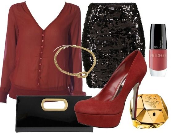 Наряд роковой женщины: модный в этом сезоне бордовый в блузке и туфлях, а дополняет произведенный эффект черная мини-юбка, расшитая пайетками. Аксессуары должны быть скромными, ведь на первый план выходит Ваша страстная натура!