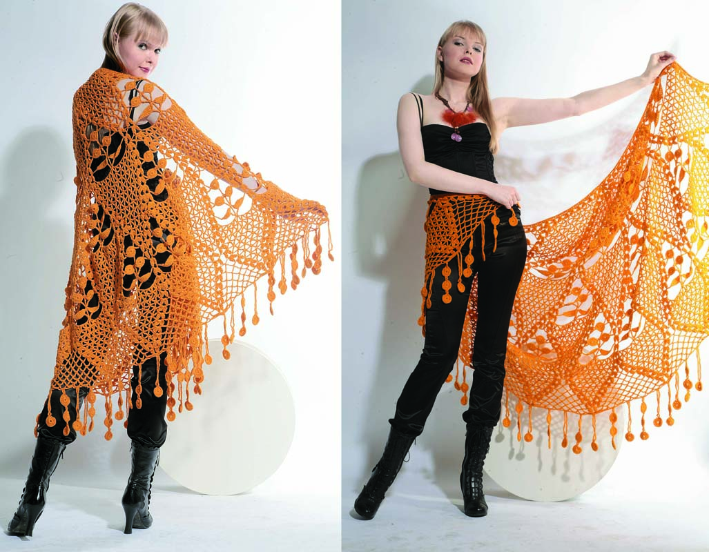 Цвет пряжи, которая долго ждала своего часа, и увиденный в журнале с салфетками элемент – дерево с круглыми плодами – придумались в очередную полукруглую шаль «МАНДАРИН». С использованием узоров для салфеток связаны в разное время из нитей различной толщины/цвета шали «Василек» и «Гвоздика», шали «Синие» и «Розовые» шишки.