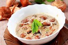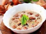 Отваренные грибы отцедить, пропустить через мясорубку, заправить молочным соусом, немного проварить, протереть через сито и посолить по вкусу. Полученную массу залить бульоном.