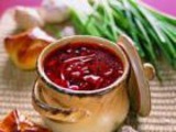 Потребуется: 300 г копченой грудинки, 2 свеклы, 300 г свежей капусты, 1 репчатая луковица, 1 крупная морковь, 4 зубчика чеснока, 2 ст. ложки томата. Кроме того, 100 г сметаны, 1 ст. ложка муки, по корню петрушки и сельдерея, лавровый лист, зелень, сахар, уксус, соль и черный молотый перец по вкусу.
