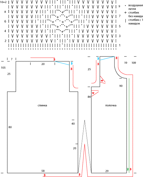 Спинка. Цепочка, набранная основным крючком, немного стягивает полотно, в данной модели это недопустимо, поэтому начальная цепочка набирается более толстым крючком. Набрать крючком 5.0. цепочку из 67 в.п., отметить середину и связать крючком 4.0 столбиками с 1 накидом первый ряд полотна, вместо среднего столбика – воздушная петля. Далее вязать основным узором по схеме прямое полотно до высоты 80 см.