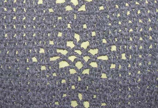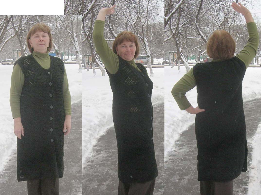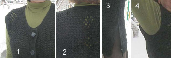 Вязать из темной пряжи трудно, для работы без ошибок необходимо хорошее освещение, лучше дневное. Для этого теплого длинного черного жилета были выбраны узоры, требующие меньше внимания, узоры, в которых крючок вводится в большие отверстия, в промежуток между столбиками (галочки) и под дугу из в.п. (ромб из косой сетки), столбики в вершину использованы в очень ограниченном количестве в основном узоре и в обвязке. Для изготовления жилета 56 размера потребовалось около 800 г пряжи 1600/100 г в 8 сложений (далее просто «нить»), крючок 4.0. для основного полотна и 5.0 для наборной цепочки, 8 пуговиц. Горловина овальная, пройма прямоугольная.