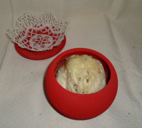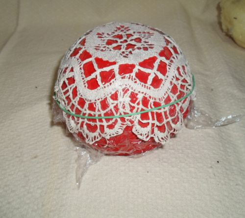 2. Если по замыслу композиция зимняя, можно добавить «морозные узоры» из салфетки. Чтоб салфетка повторяла форму горшка, густо крахмалим ее, отжимаем и расправляем. Горшок поворачиваем вверх дном, защищаем пищевой пленкой, наверх раскладываем салфетку и фиксируем ее на горшке резинкой.