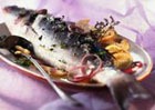 Достать рыбу из фольги и подать на стол с шампиньонами и луком.