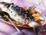 Потребуется: 0,5 кг любой рыбы, 150-200 г шампиньонов, 1 репчатая луковица, лимонный сок, растительное масло, белое вино, соль, черный молотый перец и приправа для рыбы по вкусу.