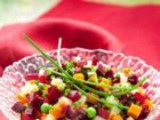 Потребуется: 500 г картофеля, 300 г свеклы, 200 г моркови, 200 г репчатого лука, 100 г консервированного горошка, 50 г изюма, 200 г соленых огурцов, 1 лимон. Кроме того, 100 г растительного масла, 100 г сухого красного вина, 50 г 3%-го уксуса, 30 г горчицы, черный перец горошком, соль.