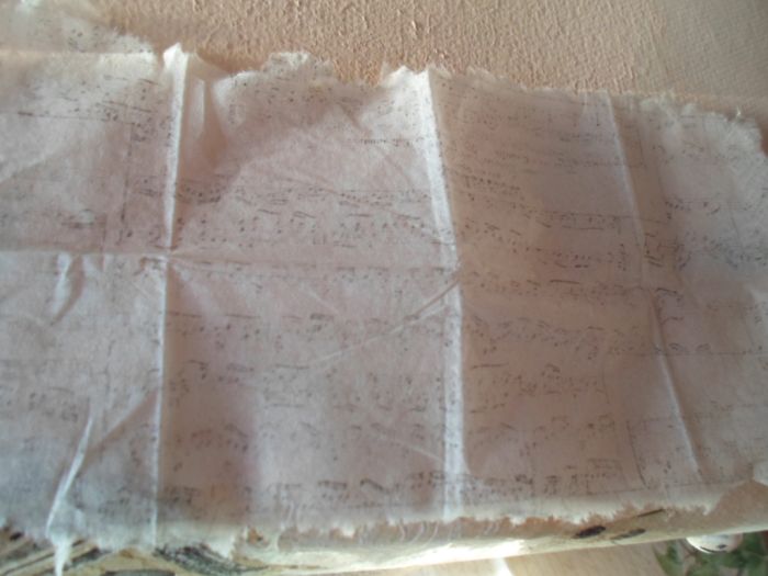 Используя второй слой салфеток с нечетким ненасыщенным цветом рисунком, я заполняла пространство между фрагментами с первым красочным слоем салфеток. Обратите внимание: на фотографиях видны одинаковые фрагменты — яркие и едва заметные: скрипичный ключ, нотные странички… Лично мне очень понравился эффект.