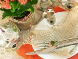 Чуть выше, в 10-15 сантиметрах слева от сервировочной тарелки, ставят пирожковую тарелку, она предназначена для хлебобулочных изделий. Рядом с ней ставят чашку с теплой водой и листиками мяты или ломтиком лимона, для ополаскивания пальцев. Она понадобится, если вы закажете омаров, устриц, спаржу и т.д.