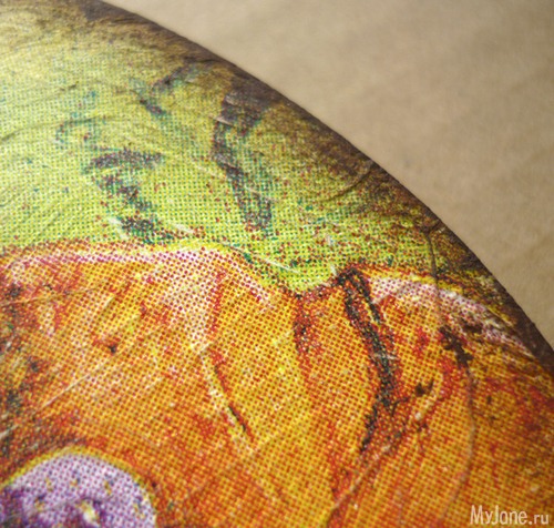 Когда краска высохнет, берем верхний красочный слой салфетки, отделив его от белых слоёв. Покрываем салфеткой нашу заготовку и поверх рисунка промазываем клеем ПВА, разведённым наполовину водой, используя плоскую синтетическую кисть. Делаем это так - мазками кисти, обильно смоченной в клее, разглаживаем салфетку ОТ ЦЕНТРА К КРАЯМ.