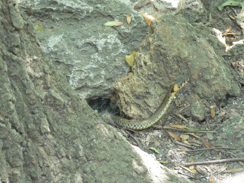 Вся территория зоопарка погружена в спасительную для путешественника тень от густо высаженных деревьев, повсюду оборудованы фонтанчики с питьевой водой, скамейки для желающих присесть и полюбоваться здешними красотами. Имеется также поляна с древними истуканами, элементы ландшафтного дизайна в виде перекинутого мостика через ручей. Кстати, возле этого мостика мы неожиданно обнаружили ужа, свободно перемещавшегося за пределами вольеров.