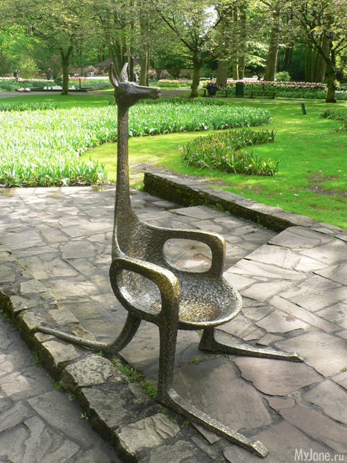 Койкенхоф – это не только плантации тюльпанов, это еще и прекрасный ландшафтный дизайн. Цветочные клумбы пронизаны дорожками для прогуливающихся посетителей. Каскады фонтанов сменяются живыми зелеными лабиринтами и озерами с плавающими грациозными парами белых лебедей. Повсюду скамейки для желающих присесть. Также парк наполнен десятками скульптур.