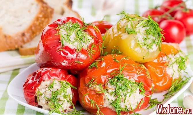 При подаче полить перцы сметаной, смешанной с измельченным чесноком.